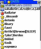 - И, наконец, чтобы войти на канал, нужно: в главном меню выбрать пункт Conference (Конференции), в поле Room заполнить имя_канала%IRC_сервер, например, sahalin%irc.xl.ru, в поле Host ввести имя Вашего IRC-транспорта, например, irc.e.jabber.ru, выбрать Join в меню. Если все прошло удачно, в списке контактов Вы увидите новую группу, носящую название канала и IRC-сервера: