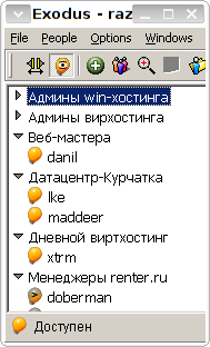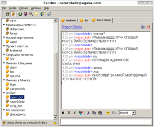 Exodus — свободный XMPP-клиент с открытым кодом. Несмотря на преклонный возраст проекта, Exodus представляет из себя идеологического наследника клиента WinJab, который, в свою очередь, является одним из первых реализаций клиентской части Jabber/XMPP, продолжая развиваться. По состоянию на август 2008 года в дереве исходных кодов есть правки с давностью в несколько часов.