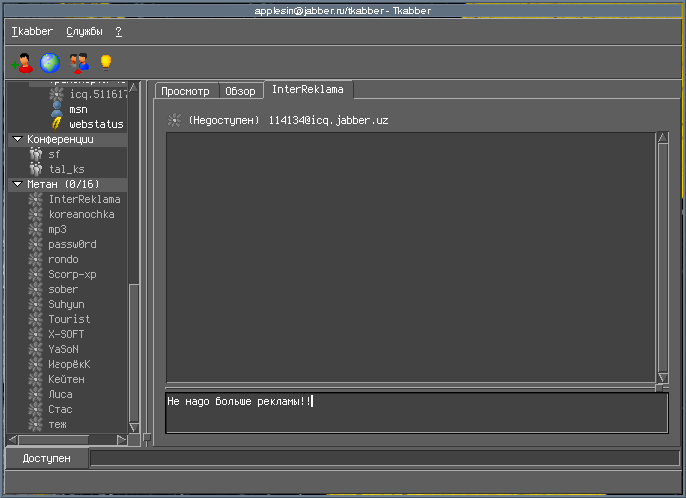 | 09:55, 24 February 2007 | Tkabber.png (file) | 17 KB | Applesin | Ростер и окно разговора находятся в одном окне, что удобно при использовании нескольких аккаунтов - на запутаешься в окнах. | 1 | |